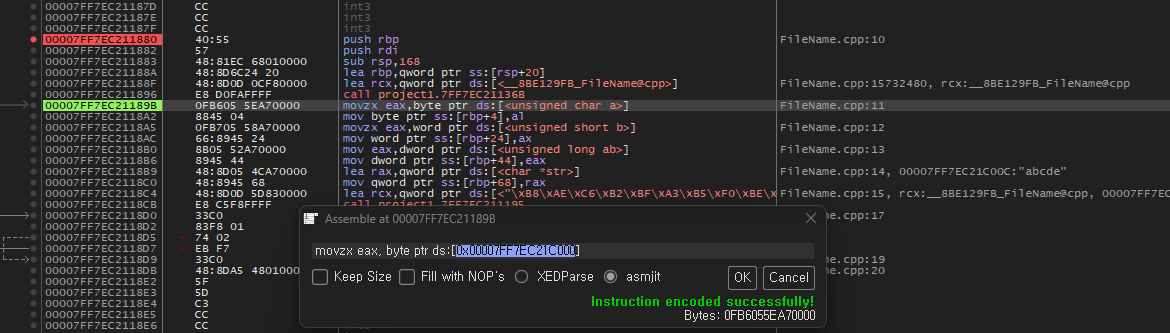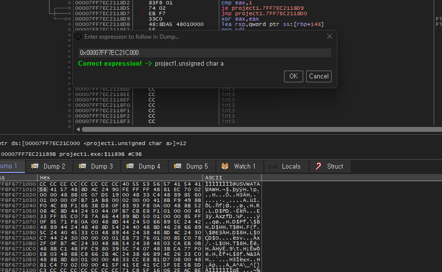 0x00007FF7EC21C000 주소에 BYTE의 값이 들어가 있는것 같습니다. 확인해보도록 합시다.