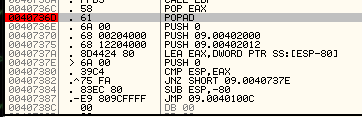저번에 9에서도 비슷한것을 보았지만 PUSHAD로 레지스터 값을 스택에 저장하고 나중에 원본코드가 다 복구되면 메모리에 POPAD 명령을 통해서 다시 레지스터 값을 참조하게 될것이다. 그래서 PUSHAD를 수행한후의 ESP 값에 BP를 설정해주면 쉽게 OEP로 분기가 가능하지 않을까 생각을 해보았다.