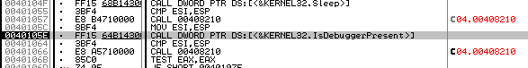 0040105E주소에서 KERNEL32.lsDebbugerPresnt 라는 함수이름이 보인다.