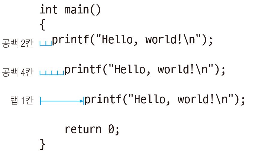 다음과 같이 들여쓰기 방법은 공백(스페이스) 2칸, 4칸, 탭(tab) 등 여러 가지 방법이 있다.