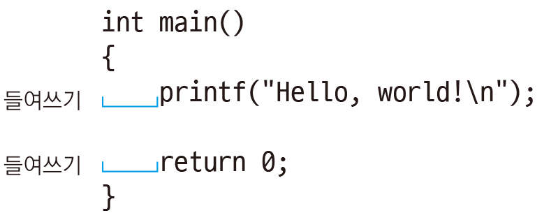 C 언어에서는 들여쓰기 방법이 문법으로 정해져 있지 않다.